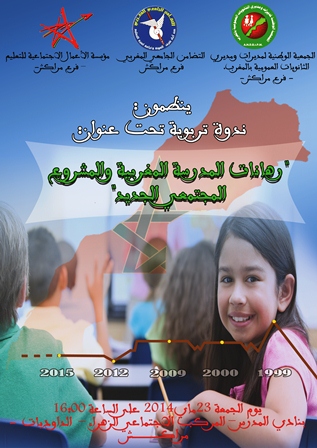 تنظم الجمعية الوطنية لمديرات ومديري الثانويات العمومية بالمغرب- فرع مراكش بشراكة مع منظمة التضامن الجامعي المغربي فرع مراكش ومؤسسة الأعمال الاجتماعية للتعليم فرع مراكش ندوة تربوية تحت عنوان:رهانات المدرسة المغربية يوم الجمعة 23 مايو 2014 ابتداء من الساعة 4 بعد الزوال، بنادي المدرس بالمركب الاجتماعي الزهراء بالداوديات.