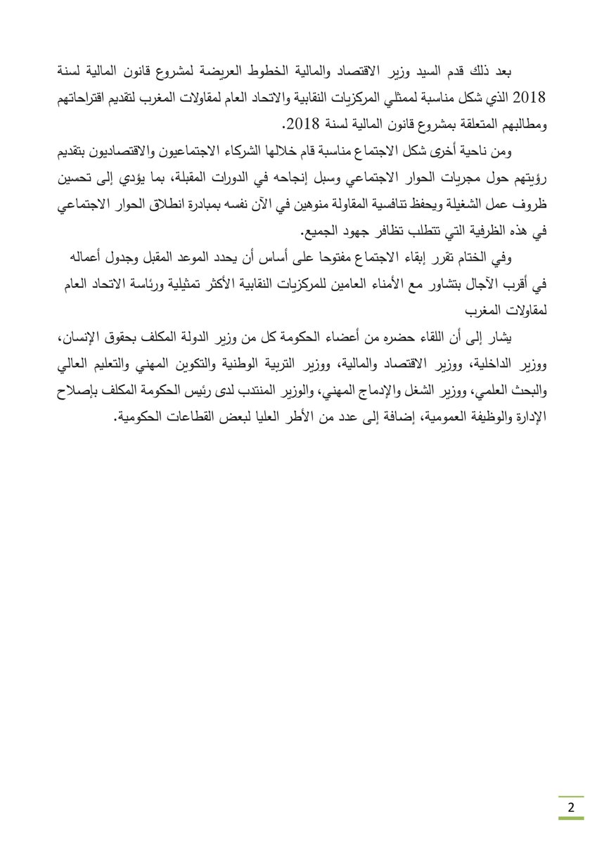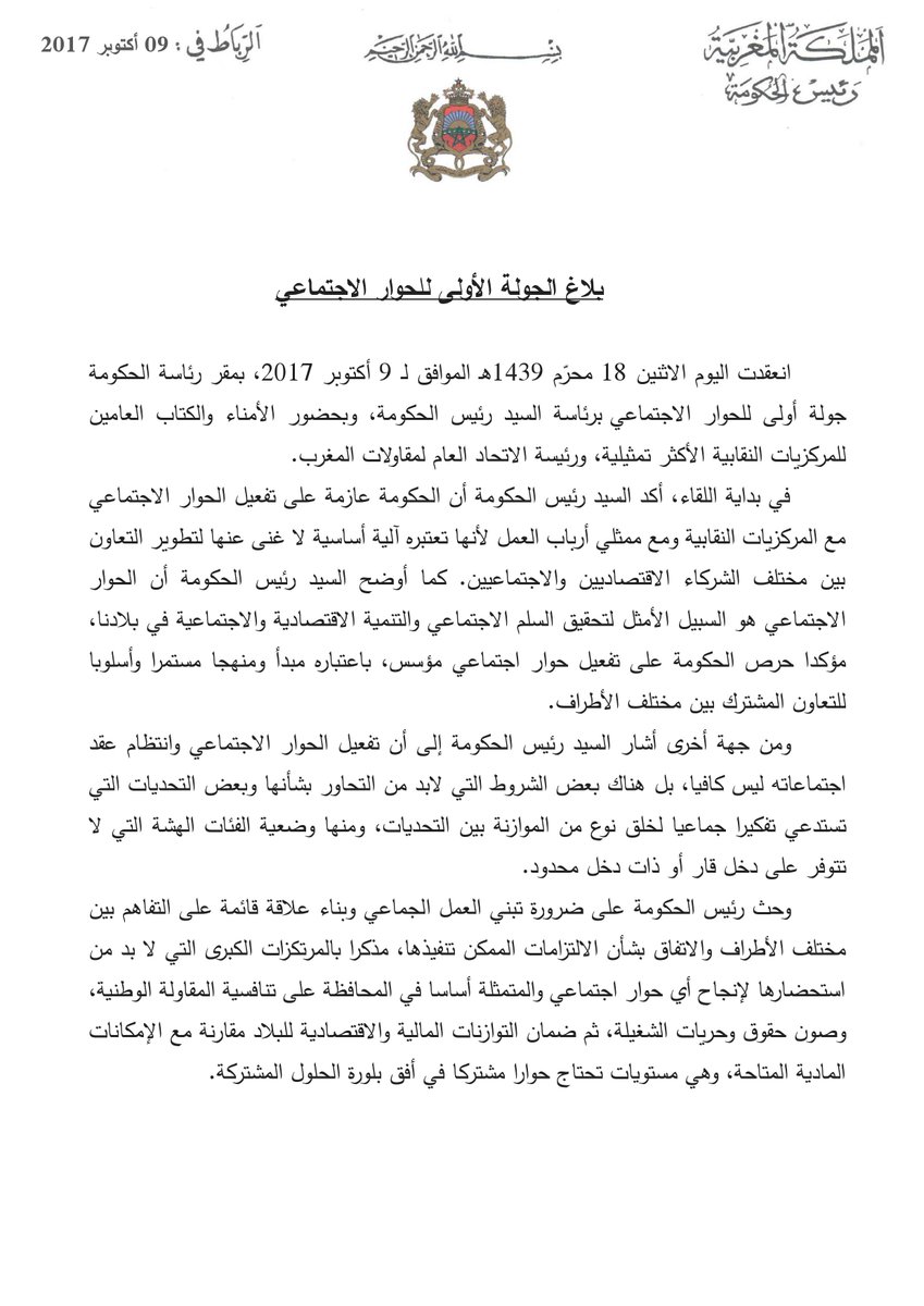 بلاغ رئاسة الحكومة حول الحوار الاجتماعي 09/10/2017